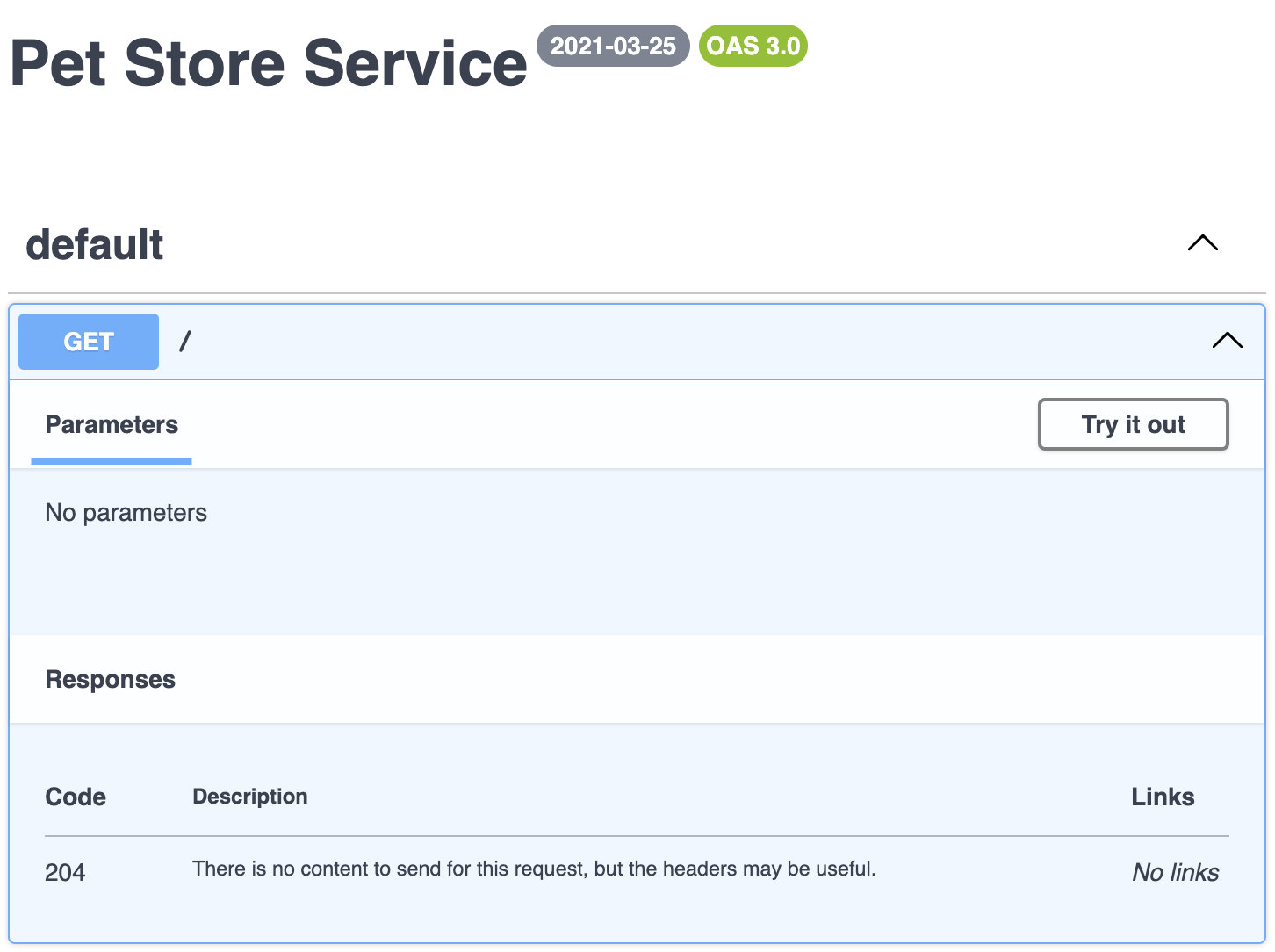 op ping(): void;openapi: 3.0.0info: title: Pet Store Service version: 2021-03-25tags: []paths: /: get: operationId: ping parameters: [] responses: "204": description: "There is no content to send for this request, but the headers may be useful. "components: {}data:text/plain;base64,W3NlY29uZGFyeV1+ICQgWy9zZWNvbmRhcnldIHNwZWN0cmFsIGxpbnQgb3BlbmFwaS55YW1sCgpbYnJhbmQudW5kZXJsaW5lXS9vcGVuYXBpLnlhbWxbL2JyYW5kLnVuZGVybGluZV0KIDE6MSAgW3dhcm5pbmddd2FybmluZ1svd2FybmluZ10gIG9hczMtYXBpLXNlcnZlcnMgICAgICAgT3BlbkFQSSAic2VydmVycyIgbXVzdCBiZSBwcmVzZW50IGFuZCBub24tZW1wdHkgYXJyYXkuCiAyOjYgIFt3YXJuaW5nXXdhcm5pbmdbL3dhcm5pbmddICBpbmZvLWNvbnRhY3QgICAgICAgICAgIEluZm8gb2JqZWN0IG11c3QgaGF2ZSAiY29udGFjdCIgb2JqZWN0LiAgICAgICAgICAgICAgICAgICAgICAgIGluZm8KIDI6NiAgW3dhcm5pbmddd2FybmluZ1svd2FybmluZ10gIGluZm8tZGVzY3JpcHRpb24gICAgICAgSW5mbyAiZGVzY3JpcHRpb24iIG11c3QgYmUgcHJlc2VudCBhbmQgbm9uLWVtcHR5IHN0cmluZy4gICAgICAgaW5mbwogODo5ICBbd2FybmluZ113YXJuaW5nWy93YXJuaW5nXSAgb3BlcmF0aW9uLWRlc2NyaXB0aW9uICBPcGVyYXRpb24gImRlc2NyaXB0aW9uIiBtdXN0IGJlIHByZXNlbnQgYW5kIG5vbi1lbXB0eSBzdHJpbmcuICBwYXRocy4vLmdldAogODo5ICBbd2FybmluZ113YXJuaW5nWy93YXJuaW5nXSAgb3BlcmF0aW9uLXRhZ3MgICAgICAgICBPcGVyYXRpb24gbXVzdCBoYXZlIG5vbi1lbXB0eSAidGFncyIgYXJyYXkuICAgICAgICAgICAgICAgICAgICBwYXRocy4vLmdldAo=